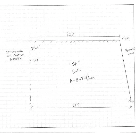 The stormwater infiltration system is the Hancor "Landsaver" product and will be about 23 feet away from the wall (as shown on the drawing).