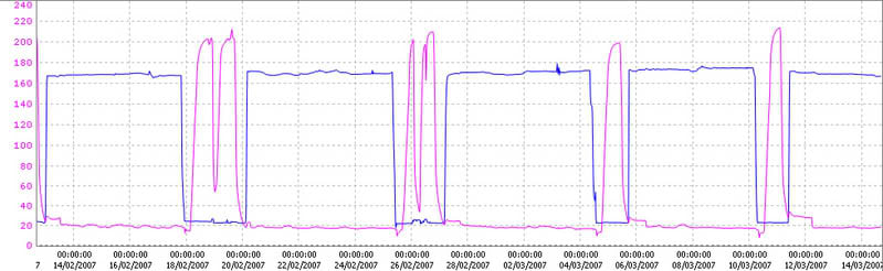 The pink line is operating temperature - it varies between ~20DegC (normal operation) to ~200degC (regen cycle) with a temperature rate change of 25 - 30 DegC/hr. The blue line is operating pressure, which varies between ~450kPa (regen cycle) to ~3150kPa (normal operation).