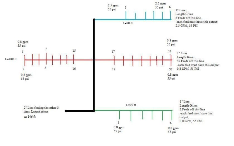 Line B is a 1" line that has 32 branches coming off of it. Each branch must have an output of 0.8 GPM, 55 PSI.
