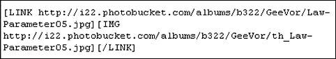 Anyway, the same image tags have to be altered on the embedded image code inside this text - as described earlier. But, in the leading tag the URL= has to be removed and replaced by LINK, followed by a space before the http:// stuff begins. The trailing tag loses its first bracket and the URL, it's replaced with LINK, so that it becomes this:-