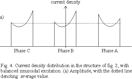 There are six conductors for each three phases, but in figure 5 the current is shown for only the three leftmost conductors of the middle phase. The conductors are about 40 units wide and the gap is about 10 units. The current in the lowest conductor is about five times bigger than in the middle conductor and is in addition concentraced on the bottom edge of the conductor. This is because of the the mutual inductances with all the other 17 currents (proximity effect).