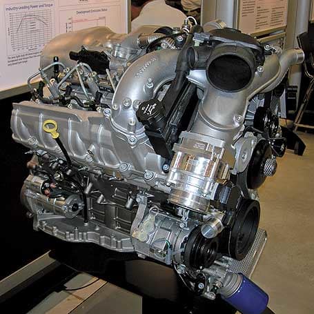 features a reverse-flow air design in which the turbochargers are mounted in the engine valley and the intake manifolds are located on the sides of the block. This new design creates a more compact engine package and reduces the width of the assembled engine. The engine uses air-to-water intercoolers, which is more efficient and orvides a shorter air path than using a standard air-to-air intercooler.