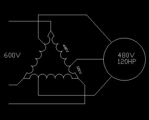 4> Two 480:120 V dry type transformers. The transformers were buck boost rated. They were connected in open delta to drop the 600 V incoming to 480 V.