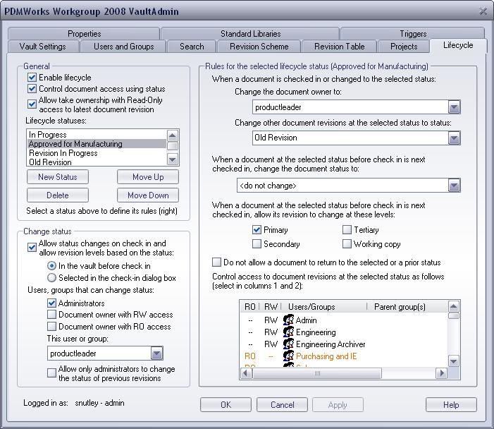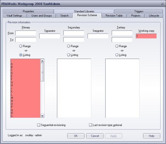 fcsuper: Yes I'm working from a list of Revisions and '-' is the first. I've attached a few screenshots of our VaultAdmin settings. The two lifecycle screens shows the two status' I'm talking about. 'In Progress' is where the working copy should be used but once it moves to 'Approved' then it should have it's first Rev level '-'.