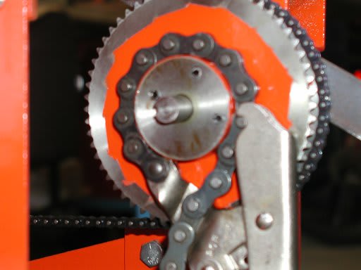 To drop the motor load I came up with an interposing gear reduction. A 20T/72T pair of sprockets welded coaxially.