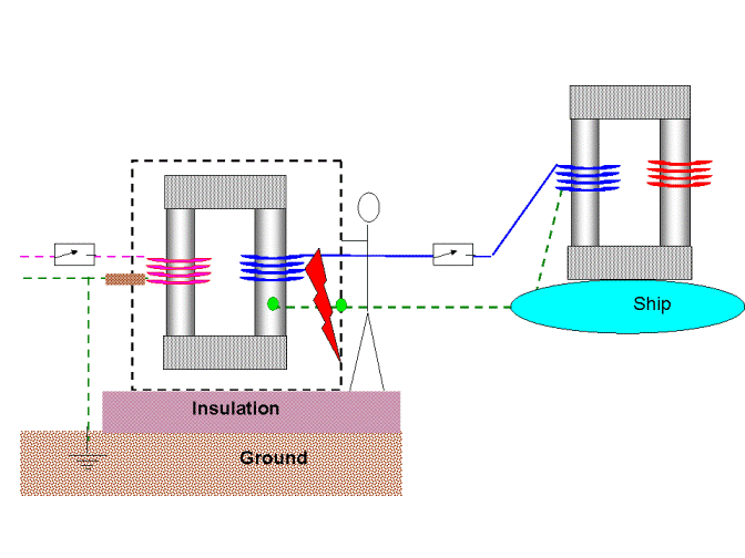 I think the on shore transformer house has to be insulated and connected to the ship grounding.
