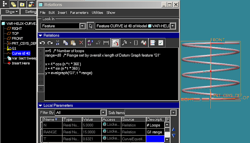 I'm going to attach a picture of the Section I created has a Sketch csys that marxs the x=0 range and is used to dimension d0 which can be linked to [range in Curve by Equation relations. The Height curve has two arcs at either end to vary pitch back to zero to stop and stop axial translation smoothly.