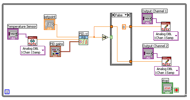 there is a single input coming from a temperature sensor, but then two controller outputs, or actuators, being used to change the temperature. PID can output both positive and negative values, so this example uses a case structure to decide when each actuator will be used. Let's say that output channel 1 is connected to a heater and output channel 2 connects to a fan for cooling the system. If the PID output value is positive, then we want to raise the temperature by writing the output value to the heater and turning the fan off by writing a zero to channel 2. However, if the PID output value is negative, the false case structure writes the output value to the fan, and a zero to output channel 1. This is a very common way of implementing PID with multiple outputs.