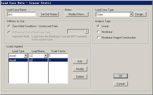When I define a load case in SAP2000, there are two types of load. One is "load pattern", and the other one is "acceleration".