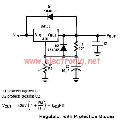 Seriously, you may be right, and a quick glance through the datasheets for the LM317 series failed to locate the circuit diagram...ah well. The problem with your solution would be the possible zapping of the diode if the reverse current could get high enough, the problem with a forward diode is the voltage drop, thus using a Schottky with its lower Vf...