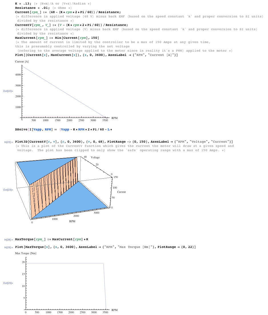 Your first post is in essence the approach I was describing. Since over the majority of our speed range, the 150 A current is the limiting factor (see the graphs of current over RPM and torque over RPM in the previously linked image http://entplex.org/forums/MotorCurrentTorque.jpg) I assume a constant torque of 18 [N*m] based on 150A * Kt. This is only a safe assumption since the majority of our operating range is with-in the continuous current limited speed range and based on the assumption that our controller will vary the net voltage applied to the motor so that the current is maintained at 150A. Both of these assumption can't be made in all situations, but in our case I don't see any reason they wouldn't apply. Once the 150A limit no longer applies, then yes the approach of solving the two equations i.e I < 150 then you do have to use the coupled pair as the aforementioned assumption no longer applies.