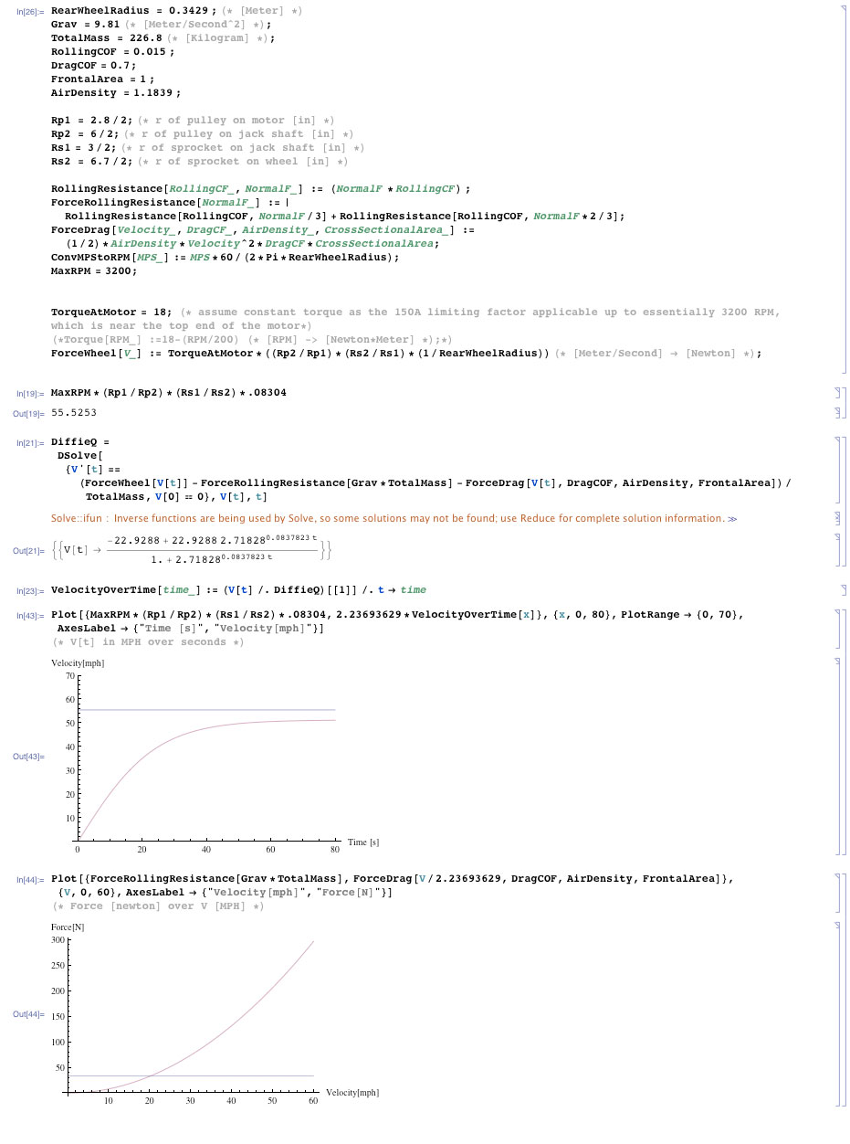 You are completely correct that I still need to factor in coulomb friction (i.e. will the drive wheel spin out), but with regard to viscous friction, is that not accounted for by the force of drag in the model, or are you referring to something else? Here is a image with the calculations, including the equations and graphs. While working out my understanding of the motor system I have chose to simplify the physical model and exclude incline, drive train efficiency, compression of the suspension, etc. http://