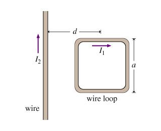 There is a typical problem that I came across in the books is where you have A square loop of wire with side length a carries a current I_1. The center of the loop is located a distance d from an infinite wire carrying a current I_2 . The infinite wire and loop are in the same plane; two sides of the square loop are parallel to the wire and two are perpendicular.