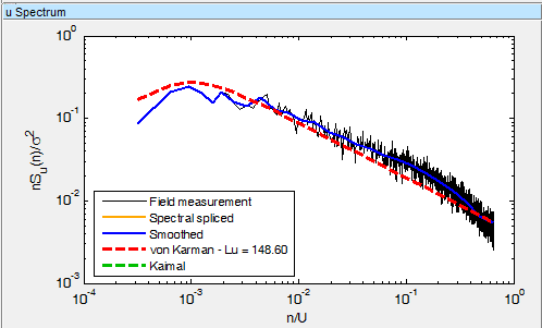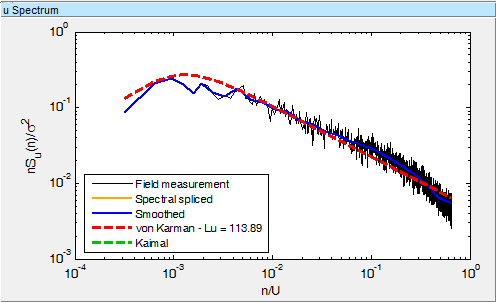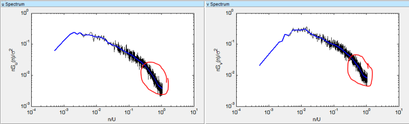 2. When applying the curve fitting algorithm to determine the integral length scales according to the von Karman equation what is the correct procedure: curve fitting the original data, which gives more weight to higher frequency data points? or using the logarithmic frequency smoothed data to approximate the von karman equation, giving an equal weight to data in the logarithmic scale? In some cases I obtain very different estimates for the integral length scales using both approaches (ex: Original -> Lu=113.16 Lv=42.68 Lw=9.23; Freq. Smoothed -> Lu=148.60 Lv=30.91 Lw=14.13).