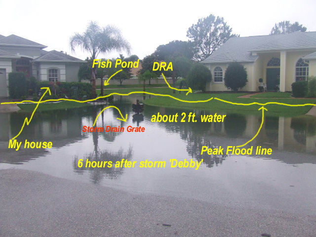 A third option, which is much simpler, is that the primary control is clogged. 457 should walk out to DRA and stand on the outlet control box, and site to his house - to see whether the top of the box coincides with the flooding elevation he's experiencing in the street. He should also see if some pesky critters haven't clogged up the primary control with sticks or what-have-you. Weir boxes in FL typically have a wooden baffle out in front of them to catch floatables, but they might not stop everything.