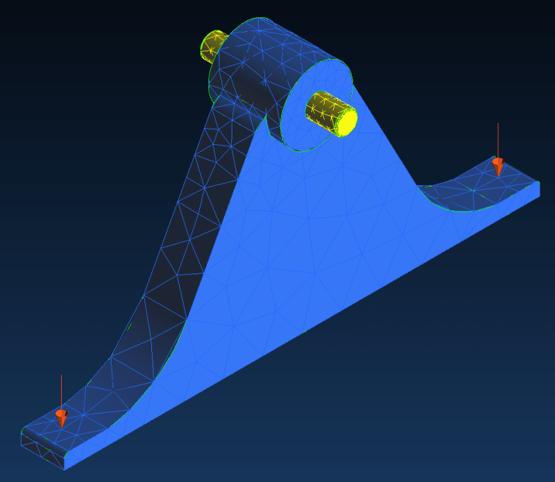 I want to perform FEA on a bracket for a top hung sliding door by modelling the weight of the door as two point loads where the bolts will be. The bracket will then be hanging from an axle (Shown in yellow) that is in turn connected to the wheel, but for simplicity I have been modelling the axles as fully fixed.