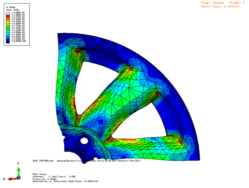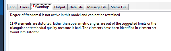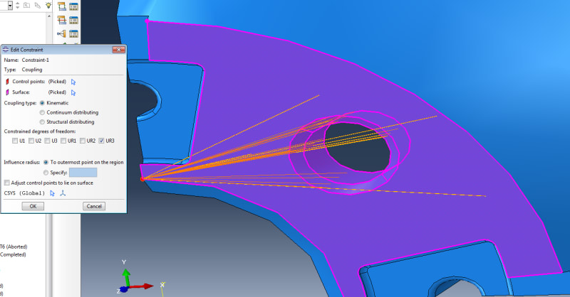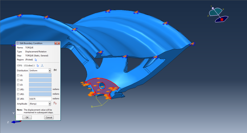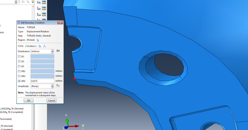 I am trying to apply a rotational displacement to a wheel which has been sectioned into 1/4. I have modeled this before so i know its possible, my issue is that it will not work again even with the same BC's etc. I basically have 1/4 of an alloy wheel with the outside rim surface fixed (to simply model tyre traction)then i apply a rotational displacement BC of 0.0175 radian (1 degree) to the inside surface which would contact the brake disc. I ran this simulation before as a proof of concept just before a meeting and did not manage to save it as i assumed it could be model very quickly again (it only took me 2 minutes to set up originally). Now when i try to run the simulation again it tells me in ABAQUS that the 'Degree of freedom 6 is not active in this model'. I know that 3D elements cannot be rotated but im not trying to rotate the elements just translate them about the z-axis. I have attached the images of the errors and the screens of my original simulation that i want to replicate.