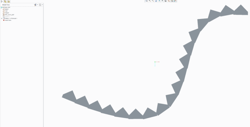 Make a curve and add a point on that curve. Then pattern the points along the curve. Create the triangle referencing the first point, making sure to use a tangent or perpendicular sketch entity to properly align the triangle along the curve. Now make a reference pattern of the triangles.