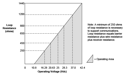 For 2 wire loop powered (passive) analog outputs there's usually a graph, sometime called a 'load line' of resistance vs voltage because higher wiring resistances can be overcome by increasing the power supply voltage: