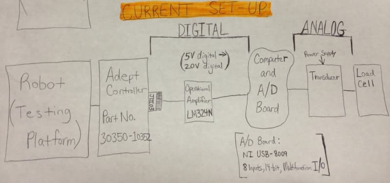 I have attached a visual schematic of the current set-up. Our ultimate goal is to be able to read force values from the load cell into our computer. In order to do that, we must have a 20 V digital [binary (on/off)] signal going into the adept controller's JDIO3 port (Part No. 30350-10352). The load cell is a JR3 100M40A. The transformer is our power supply for the load cell. The transformer is providing the 5V analog signal to an A/D board (1 input) and we are converting it to a 5V digital signal (8 outputs). The A/D board is a NI USB-6009 (http://sine.ni.com/nips/cds/view/p/lang/en/nid/201...) and the total current coming out of the A/D board is 68 mA (8.5 mA per output). We then used an operational amplifier to boost the voltage from each 5V digital outputted from the A/D board to 15V digital (here is where the problem with this set-up is, because we need 20V digital). The operational amplifier that we used was an LM324N (which can only boost our voltage from 5V to 15V). The operational amplifier circuit was done on a Global Specialties PB-10 (http://www.alliedelec.com/search/productdetail.asp...).