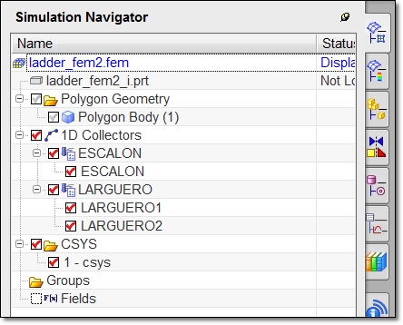 Here you are the plot of Simulation Navigator in the FEM environment, where both mesh collector and mesh items were renamed. The last one are the names that you will see under POSTVIEW, allowing you to select or deselect elements from the postprocessor. NX AdvSim use to generate one mesh item for every meshing action. If you select for meshing five surfaces at the same time, then only one meshing item will appear under the Mesh collector. If you mesh one-by-one, then five items will be.