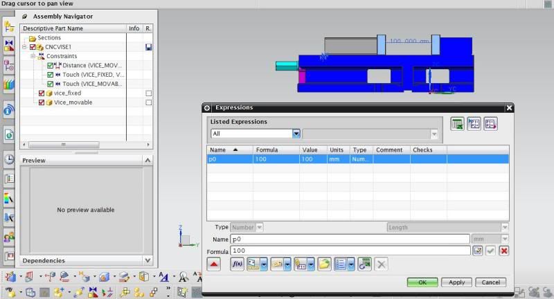 Now it it is true that I could have done this whole thing using an Assembly with the jaw as a Component and a distance constraint to control the opening, but then I would have had to override the constraint in the top level assembly. But since, and this is based on the assumption that you're simply using a purchased vise, it's simpler to use a single piece part which I could make a 'Deformable Part' from so that you would get exactly what you've looking for. So try it, open your assembly and add just the vise part as a Component and you will see how it will ask you for the jaw opening and how this will create an expression in the your assembly which can be edited to change the position of the jaw.