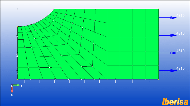 Using symmetry about a horizontal line gives the problem geometry shown. The vertical line of symmetry is deliberately ignored - using it would force a corner node to be at the peak stress position which would be unrepresentative of most of the component features of interest.