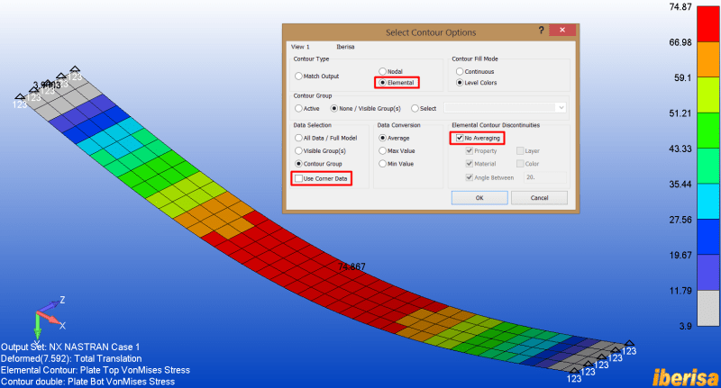 If you re-run the analyss and plot elemental vonMises stress you will see the following value: please note the options selected in the CONTOUR OPTIONS window: contour type = elemental, NOT use of corner data, and not to perform smart averaging (well, in this case is the same because not element discontinuities for material, thickness or element orientation exist). Also, in the previous window SELECT POSTPROCESSING DATA activate the option DOUBLE-SIDED PLANAR CONTOURS, this way you can see in ONE plot (simply rotating the FE model) both stress results in TOP & BOTTOM faces for Shell CQUAD4 elements: