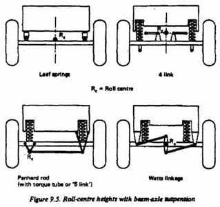 But since most suspension designs aim at having the roll center near the ground, it can be safe to assume that weight transfer distribution is only affected by springs. As shown in the next figure, the exception are cars with a beam axle, which are extremely difficult to design with a roll center near the ground (hence the comment of Greg talking about a «typical large RWD sedan»)