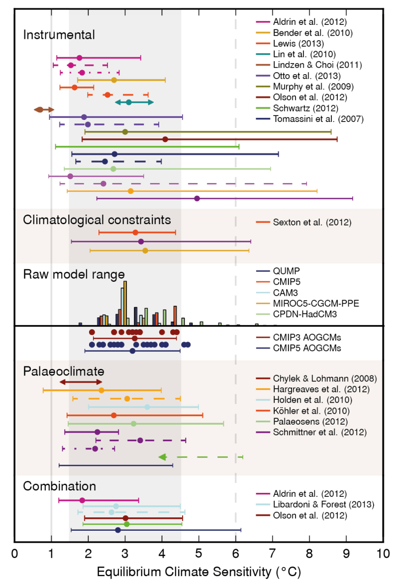 2014: As estimated by the IPCC Fifth Assessment Report (AR5) "there is high confidence that ECS is extremely unlikely less than 1°C and medium confidence that the ECS is likely between 1.5°C and 4.5°C and very unlikely greater than 6°C