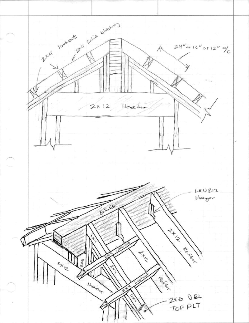 A quick glance at your Second drawing (much better design in my opinion) gives me concern about the 2x12 rafters.