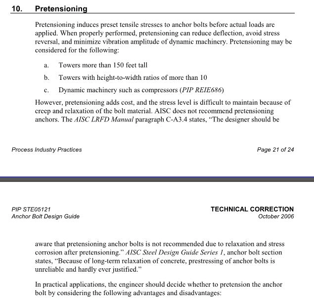 I intend to go with a prestressed AB connection for all the of reasons supplied by contributors above. My scepticism regarding pretensioned anchor bolts is, in part, informed by the excerpt from PIP STE05121, shown below. In an application where construction quality is a concern, reliance on prestressing seems like it would exacerbate the reliability problem rather than alleviate it.