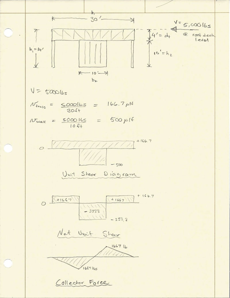 The truss, in turn, transfers the diaphragm force into the shear wall along the top plate of the shear wall.