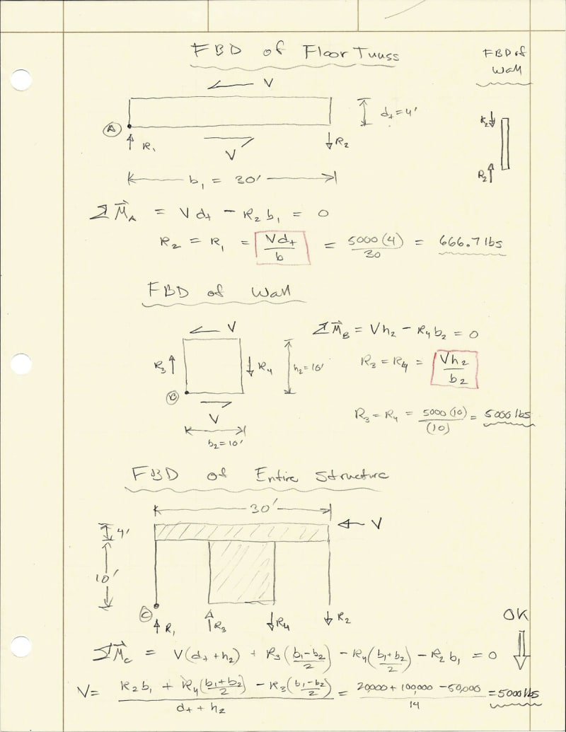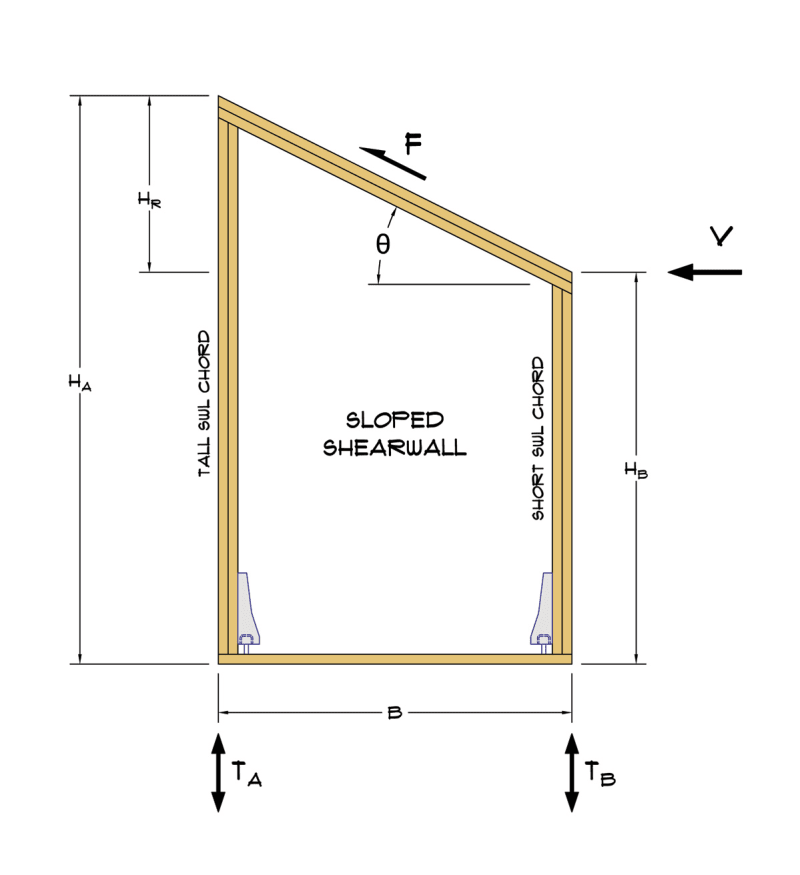 The other thing thats stands out to me from Matteson's paper is the suggestion to apply a strap at the low end of the sloping shear wall that passes over the top plate of the shear wall and connects to the chord. I've never seen this done, which doesn't mean it hasn't been done or shouldn't be, but I'm oblivious to it. Does anyone have any examples of this being done in practice, picture or diagrams would be educational. The downward force that must be provided by the strap is: Fy = F(sinθ)