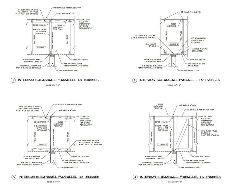 A good case in point is the three configurations given below when the trusses do not line up with the shearwall. Both congfig A and config B will have problems from vertical loads and the blocking will probably be loaded beyond allowables both in bending and in shear or as in config B the blocking will be in cross grain bending or prying. Config C would be the best method to handle this situation, which allows for the vertical deflection of the trusses under gravity loads.