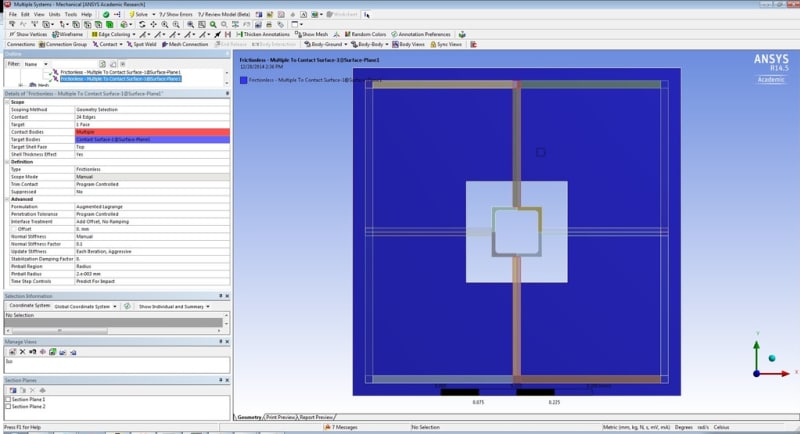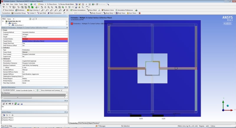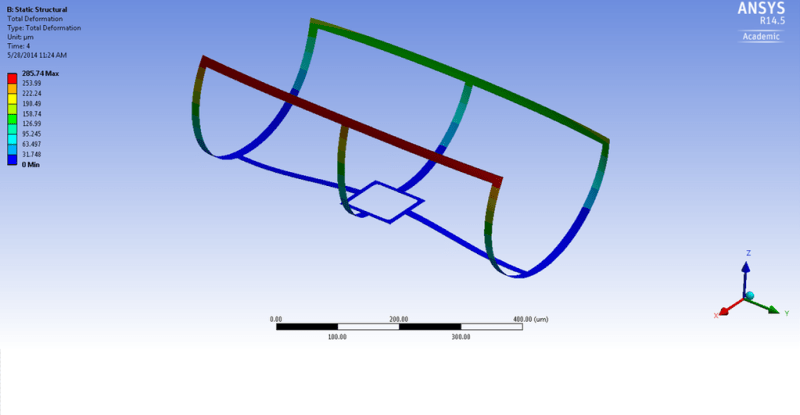 I have quite a problem on my hands trying to model a small pre-stressed MEMS device in a transient analysis. It is about 600x600um and is made of 500nm of SiO2 and 95nm of platinum. It is adhered to the substrate in the center only. The SiO2 has about 300 MPa of compressive stress which I emulate using a fictitious coefficient of thermal expansion (CTE) and a given temperature. This puts it in its buckled state which is easy to get results for. The hard part is using a bottom contact that is 10um below the surface (makes a significant difference in profile shape). Also actuating it using an input force while using contacts seems to be very difficult. It seems with this geometry that snap through occurs just as the device lifts off of the contact (which causes convergence difficulties).