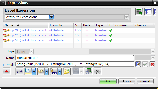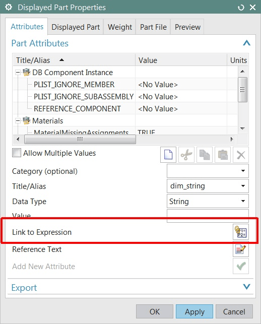 Once you've got the string attribute sorted out, then go over into the Part Attributes dialog, and pull the expression value into a string attribute with the "Link to Expression" button: