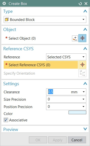 - Can reference abs, wcs or a datum csys feature as the bounding box frame reference.