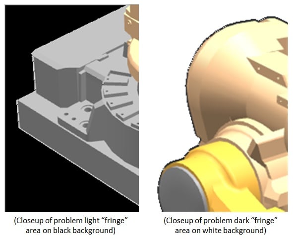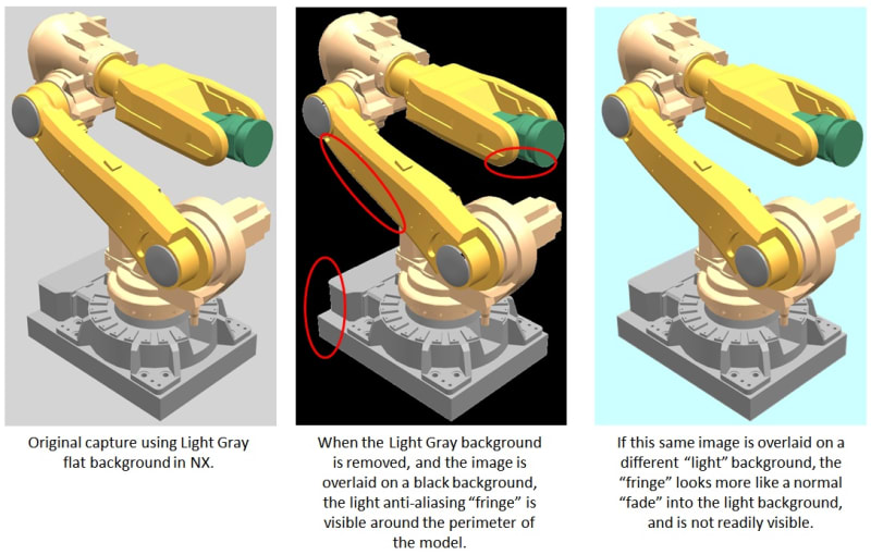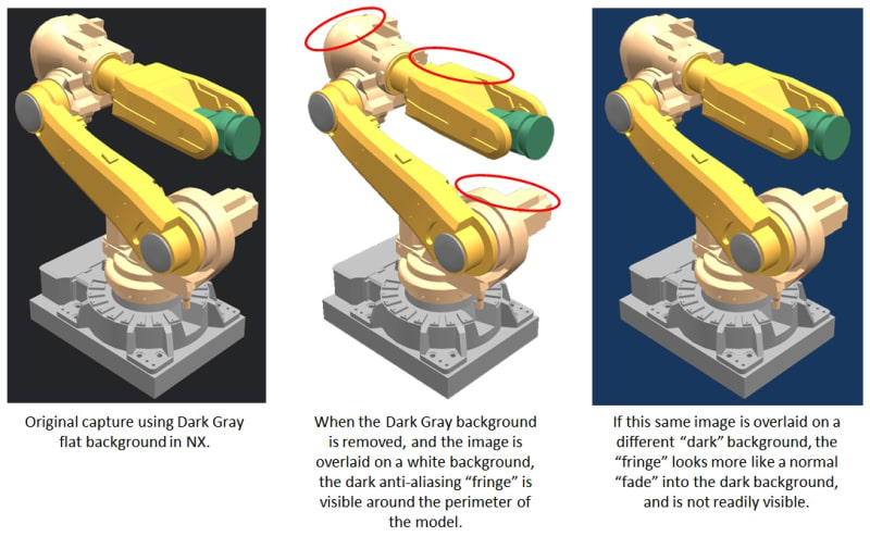 In other words, if your new (target) background is light in color, choose a light gray or white as the background color in NX when you do the screen shot (or rendering, if you're going larger):