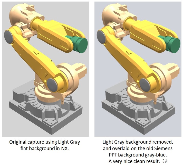 As another example, our old Siemens PowerPoint template had a light grayish-blue background color. When dropping images of NX models onto that background, I'd switch to the non-graduated gray background in NX before making the screen capture. It didn't have to match exactly, but getting in the ballpark first made the final look much better.