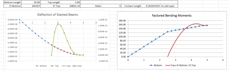 Moments in upper beam are greater than reported in previous post. However, basic result remains the same ........which is that ratio of moments in area of contact (generally at or near midspan except for values of I-upper less than about 15-percent of I-lower) is not the same as ratio of EI values for two beams.