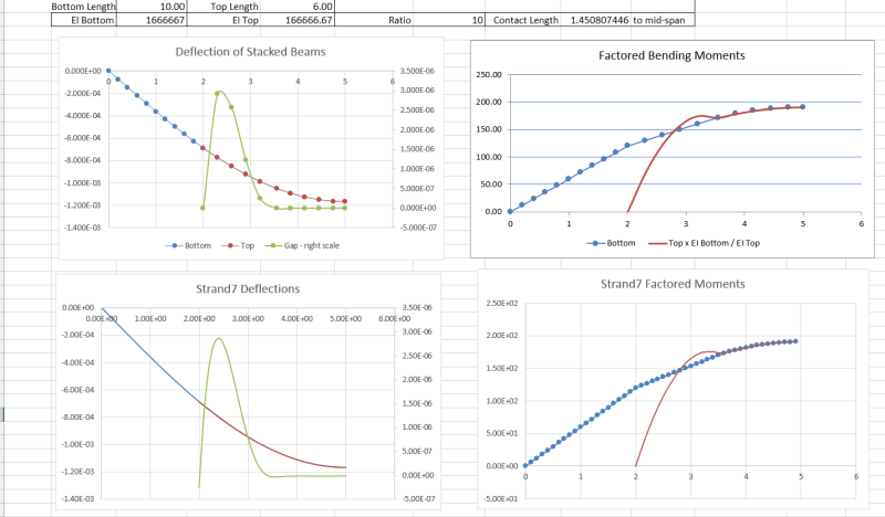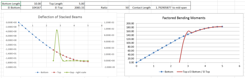 The other reason is results of my calculations........even though it has taken an inordinate amount of time to get to fairly reasonable results (mostly due to me going off on "tangent", though it was somewhat of a refresher). I would be much more persuaded to agree to position advocated by Doug if, for example, ........for the case for I-upper = 40 percent of I-lower .......if M-upper would be equal to 40-percent of M-lower at midspan, since the two beams have some length of contact (even though short) at and adjacent to midspan. My results, which I believe are "good" now (and not all that complex anyway)........show M-upper being 47-percent of M-lower at and adjacent to midspan, which is not particularly close to 40-percent (ratio of I-upper to I-lower).