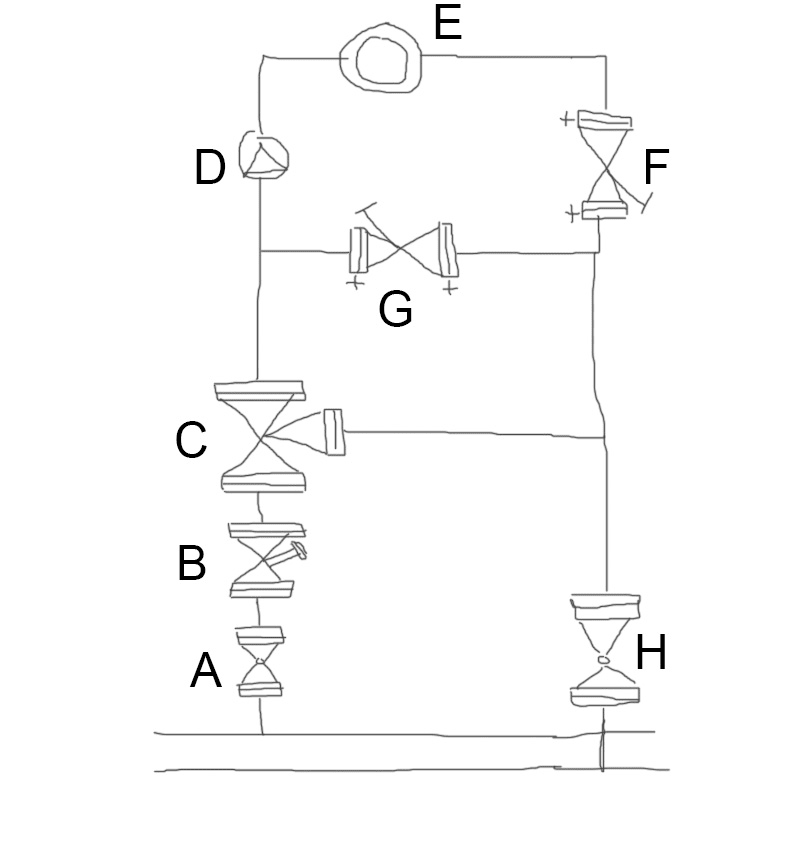 3) What's the empty circle in the middle of the valves A and H ? Is it a ball valve ? If yes, if you can also help me to understand what's a ball valve..