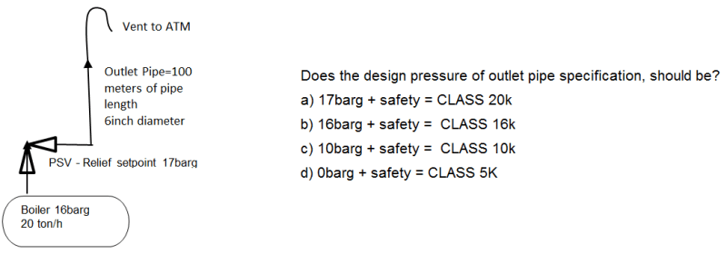 However, people at my work argument that since outlet pipe discharge to atmosphere, piping design pressure can be low(5K Class), since pressure over all the length of outlet will be {atmosphere + the pressure loss trough pipe}. I believe this is wrong, pressure at pipe will be closer to operation of boiler when PSV discharge happens. If I am wrong, please enlighten me.