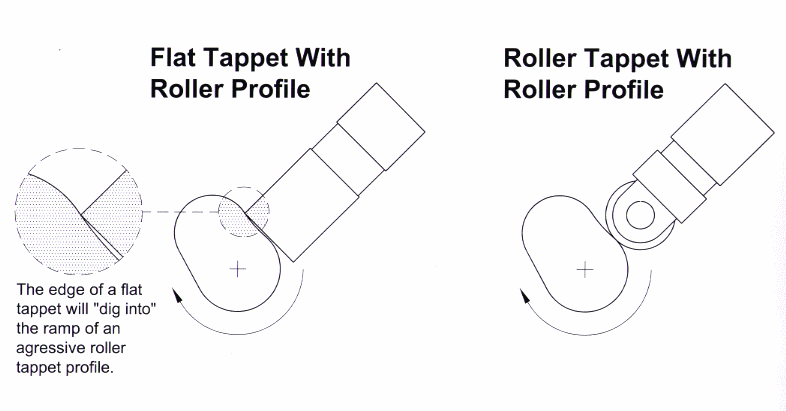 The typical roller lifter used in American pushrod V8s has a diameter and width that allows it to fit inside the lifter bore in the block. A small diameter roller follower allows a more aggressive lobe profile than a flat face follower. The lobe lift profile that can be used with a flat face follower is limited by the lobe's radius of curvature. As the lobe radius of curvature becomes larger, the face diameter of the flat follower must get smaller.