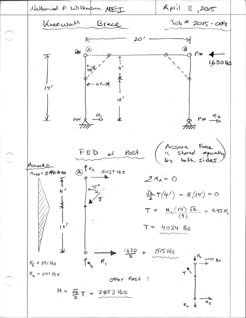 Actually, before I ran with RISA, I first checked to see what would happen if just the embedded posts tried to resist the load without any knee braces and assuming 815 lbs at 14 ft off the ground I get a 11,410 ft-lbs ground line moment. That certainly wasn't going to work.