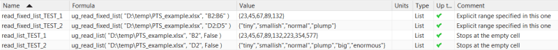 ug_read_fixed_list() is the simple one. It takes a spreadsheet name and a cell range as inputs. It returns the contents of the range in a list.