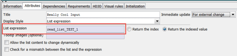 Populate the "list expression" field by dragging and dropping the desired list expression from the Model Explorer (the table with the eyeball on it) into the field: