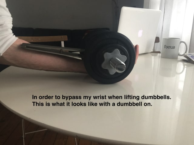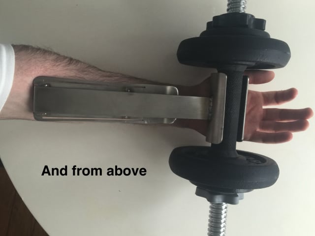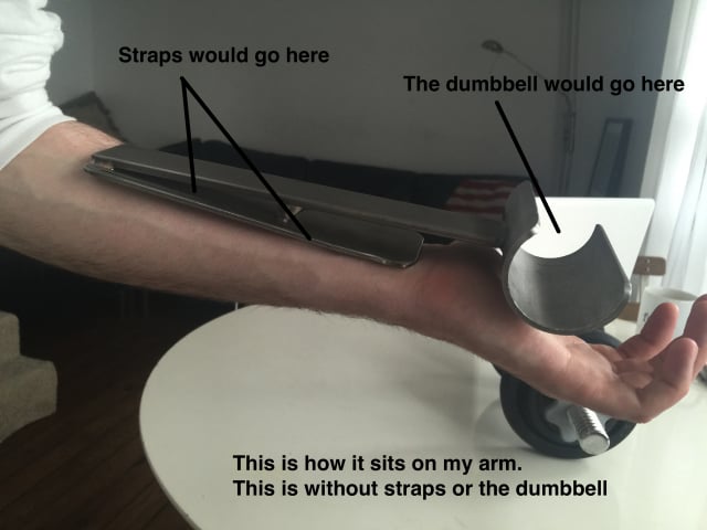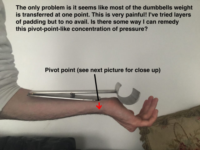 After a wrist injury I had to stop lifting weights. This was annoying so I decided to make an arm brace that would transfer the weight of a dumbbell through my forearm rather than through my hand and wrist (with the help from my local metal works). I've now got the brace and its perfect, aside from one flaw. One point on the brace acts as a pivot point concentrating the pressure in one area of my forearm. This makes lifting dumbbells very painful!