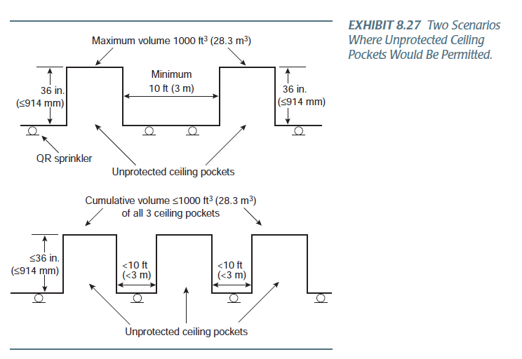 The room has a "reverse soffit" border against all walls. The lower ceiling is at 15'-0'. The high ceiling elevation in the bordering pocket is 18'-0". The width of the pocket on the 28'-0" walls is 3'-0". The pocket along the longer walls is 2'-6". NFPA #13 2013 edition addresses ceiling pockets and skylights, but not surrounding pockets as described above. It doesn't see logical that these pockets should be protected. The entire floor area is protected used 11.2k Tyco E.C. at 16X16 spacing.